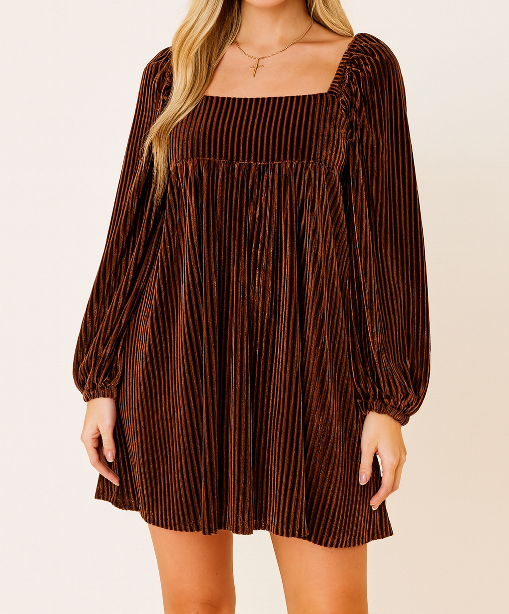 This brown velvet babydoll dress features a flattering, elongating silhouette with a chic square neckline and long sleeves. Its sweet ruffled hem adds a touch of feminine charm, while the unique back tie design brings stylish detail. Perfect for pairing with sandals, heels, or flats, this versatile dress effortlessly elevates your look for any occasion.