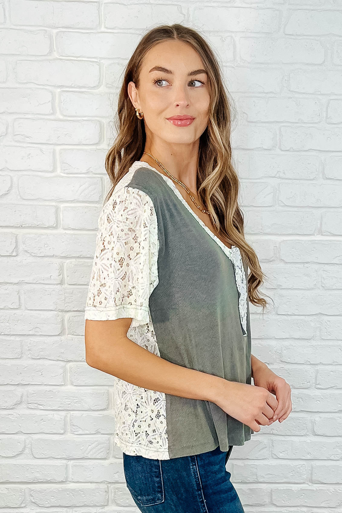 Get a fresh look with the Where'd You Get That V-Neck Top! The ribbed knit fabric flatters your figure, while the lace with light green contrast adds a touch of elegance. The functional half front buttons allow for extra style and raw edge details add an edgy twist. Upgrade your wardrobe now!